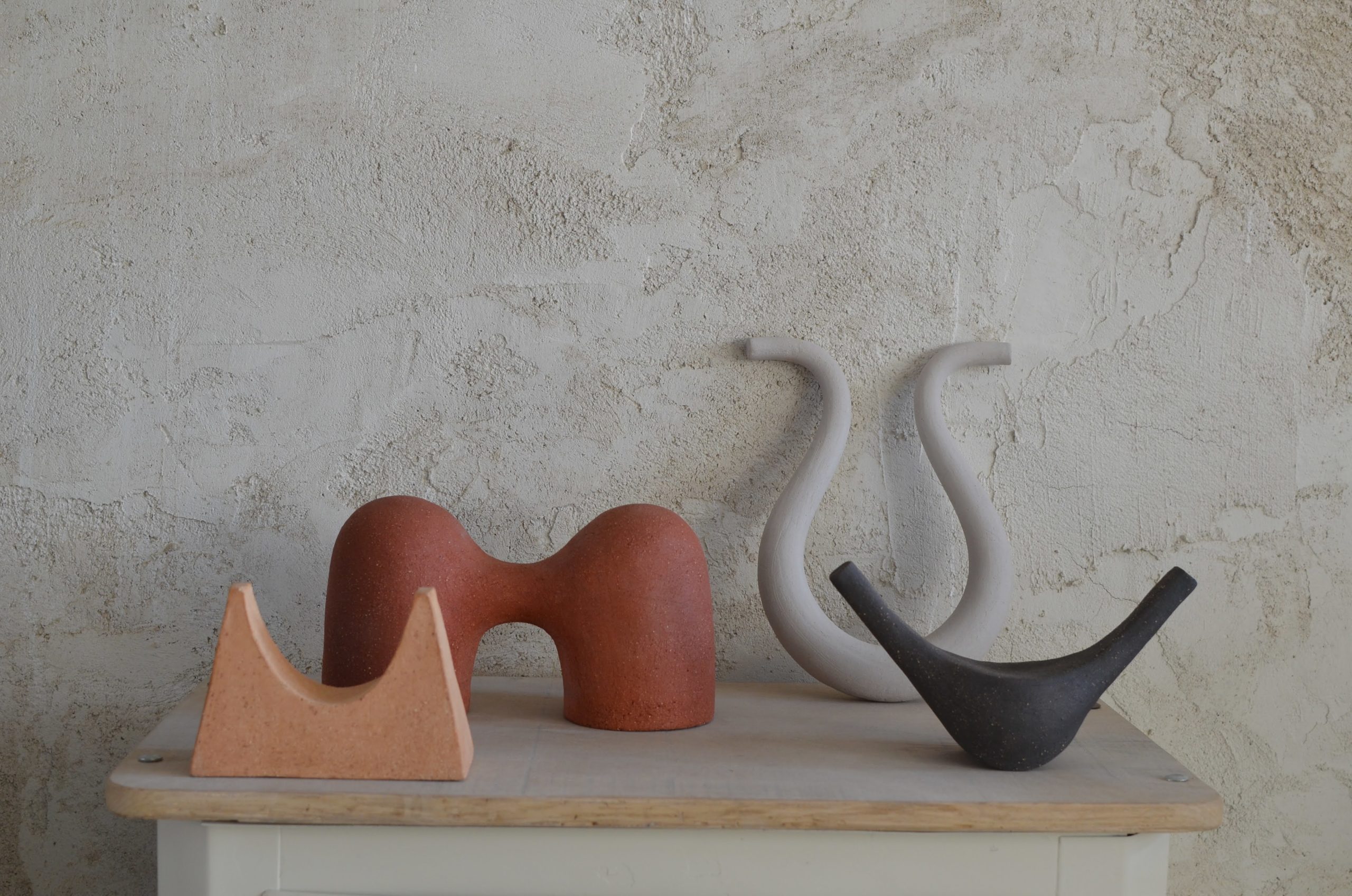 El modelado de pequeños y medianos volúmenes, cocción a diferentes temperaturas sin utilizar esmaltes es una constante en mi obra actual. Es la materialización de un mundo de formas que, aunque abstractas, parecen familiares.