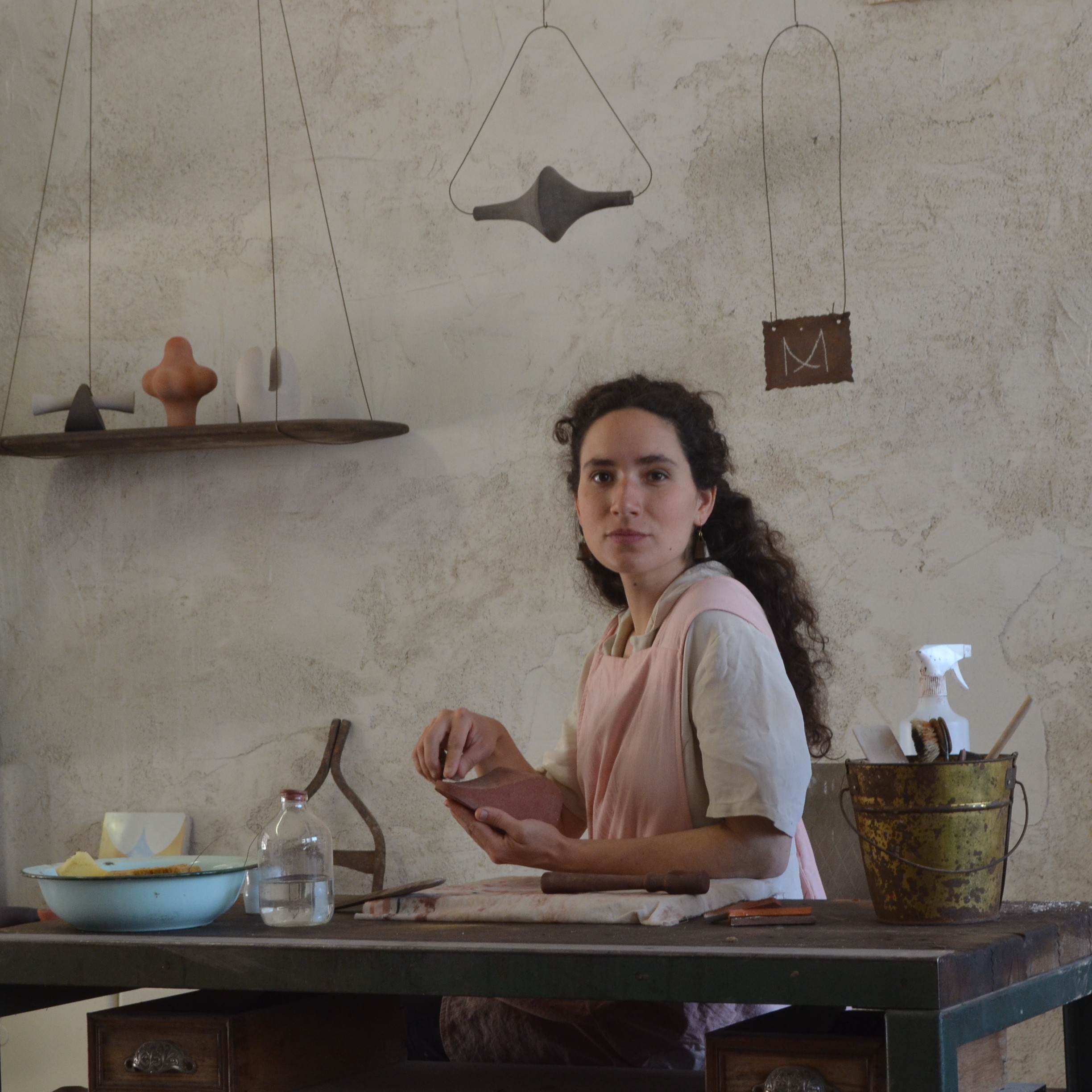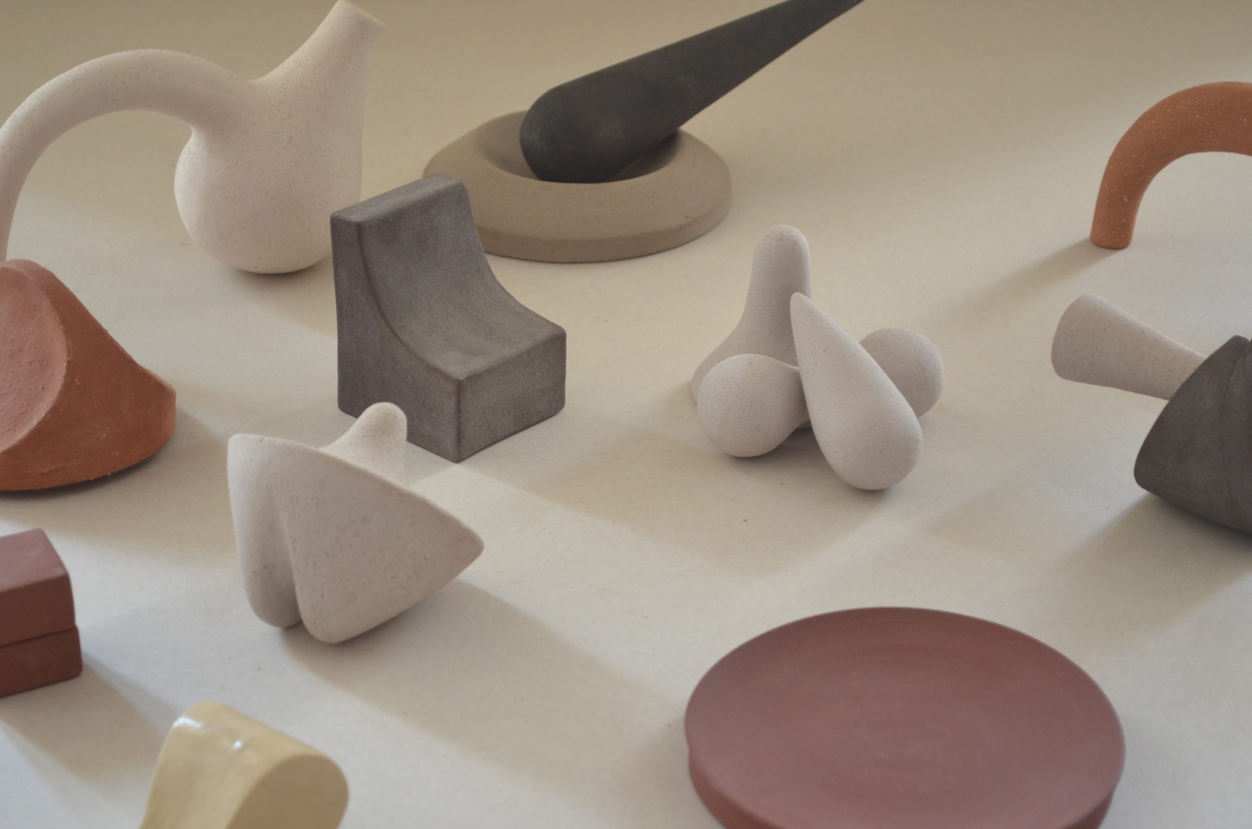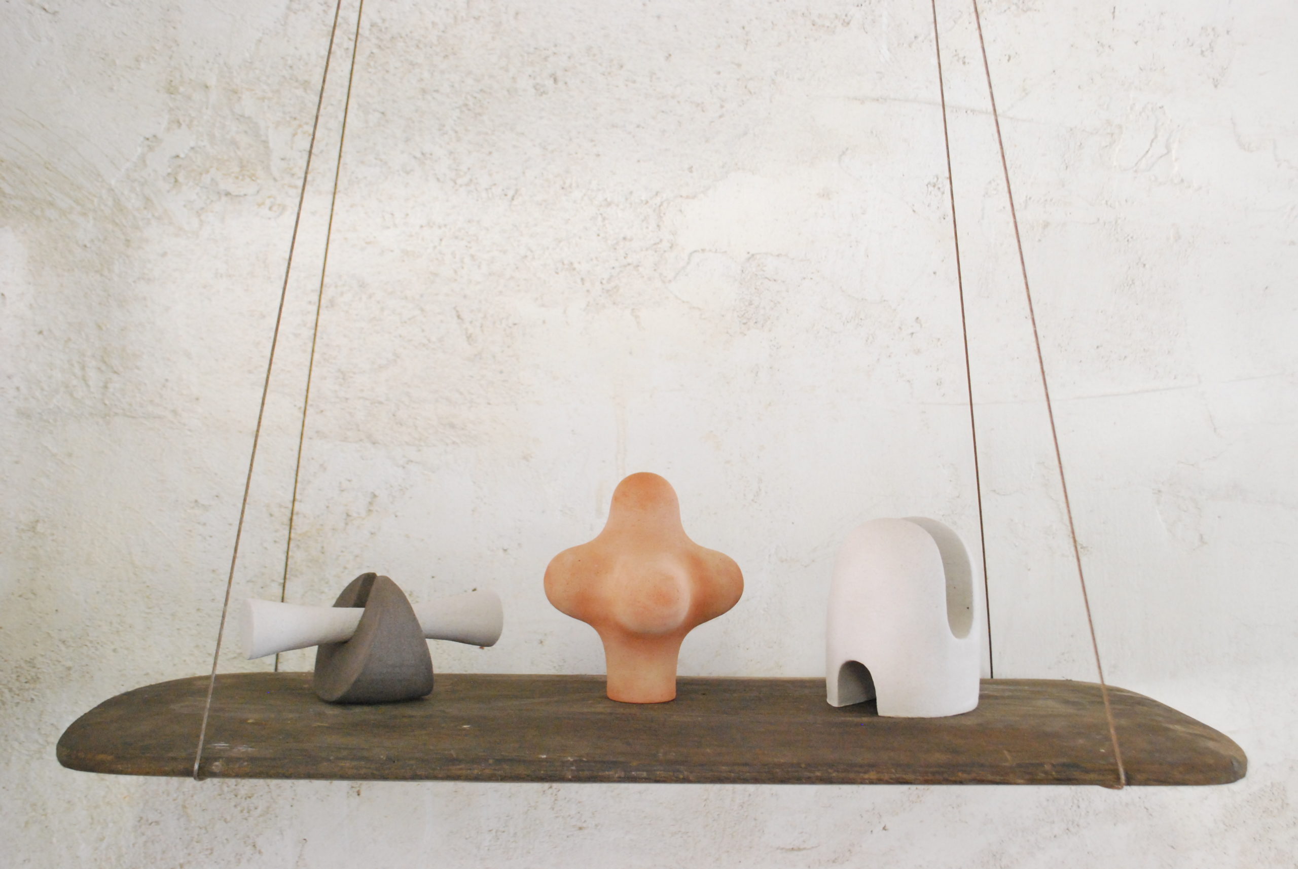 Trabajo a partir de un material noble y vernáculo: la arcilla. A través de ella cuestiono la forma en que la historia de la vida humana se desarrolla junto con la de los objetos. Formas primitivas, universales y reconocibles (esferas, conos, cilindros y planos), juegan y crean nuevos cuerpos elementales y atemporales.