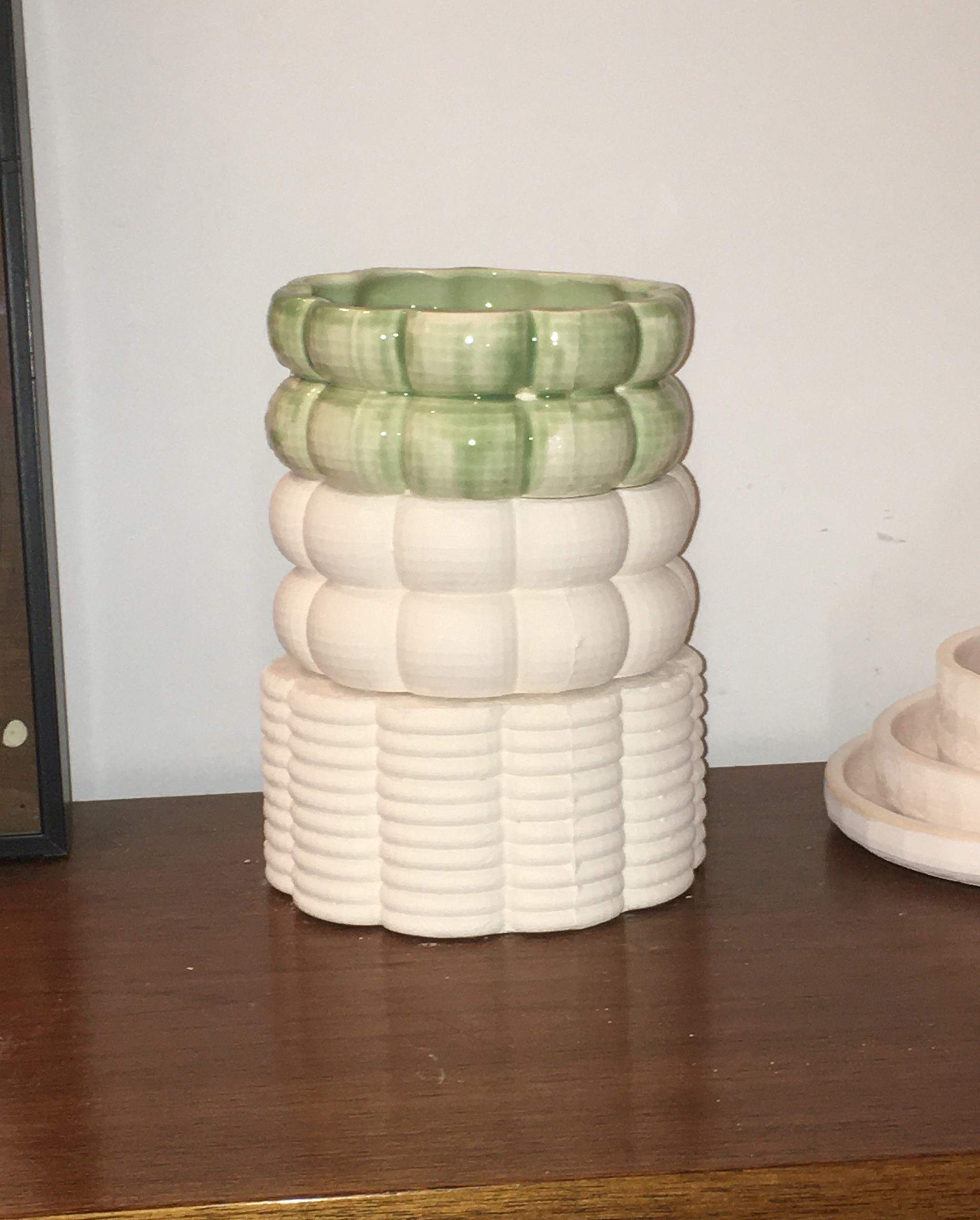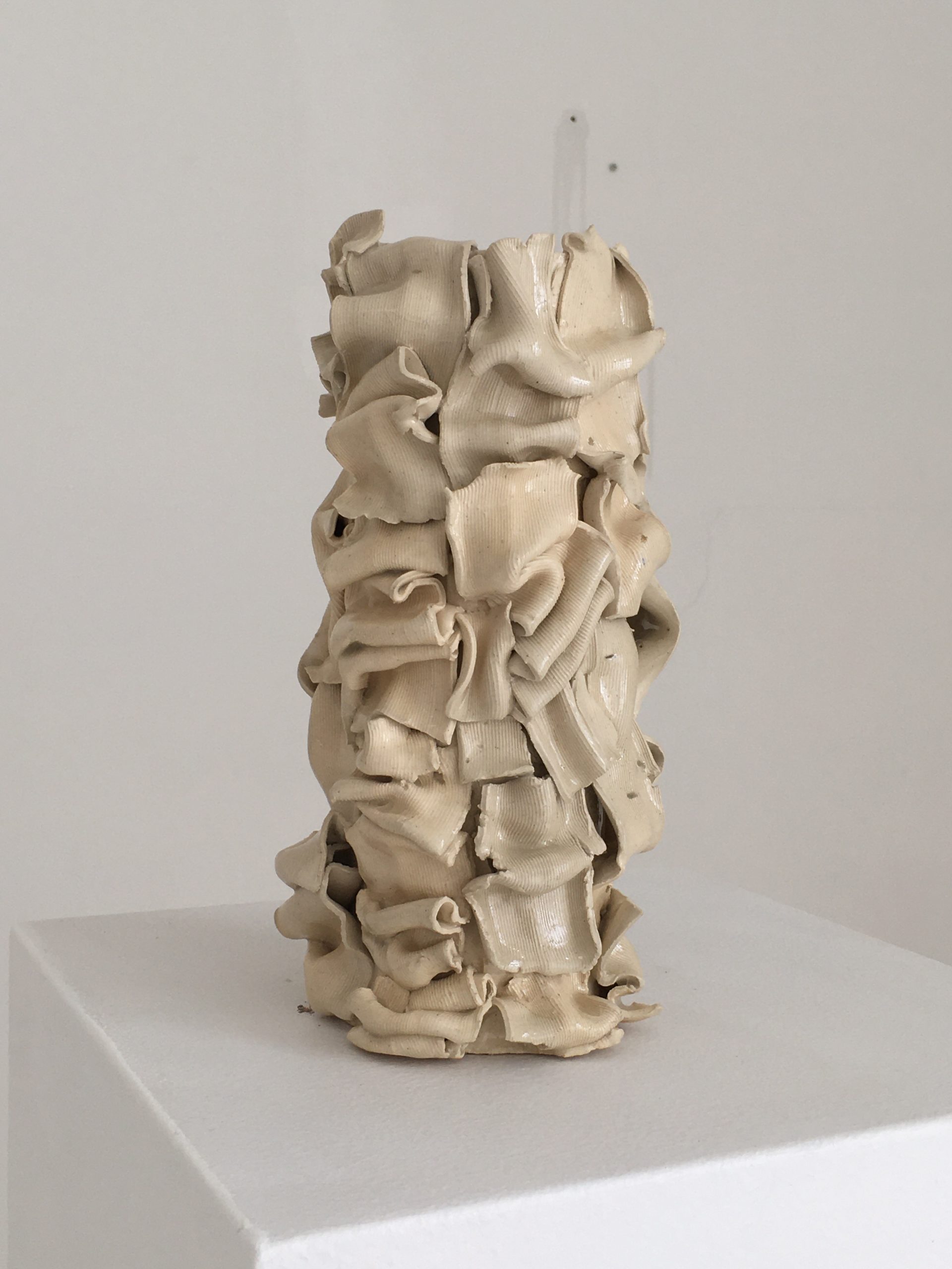 Como parte de mi proceso de investigación y experimentación he realizado residencias en Fab Lab Santiago (“Digital Craft”, 2018) y en Sculpture Space New York en 2020. Uno de mis últimos proyectos es Glitch Series, donde trabajo con cerámica esmaltada, moldes de fabricación digital, telas y extrusores. Surge de la exploración con la técnica de vaciado en cerámica y moldes fabricados digitalmente. En el proceso se descubre el error y su atractivo, para tender intencionadamente hacia él en la creación de las piezas de esta colección.